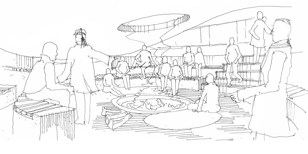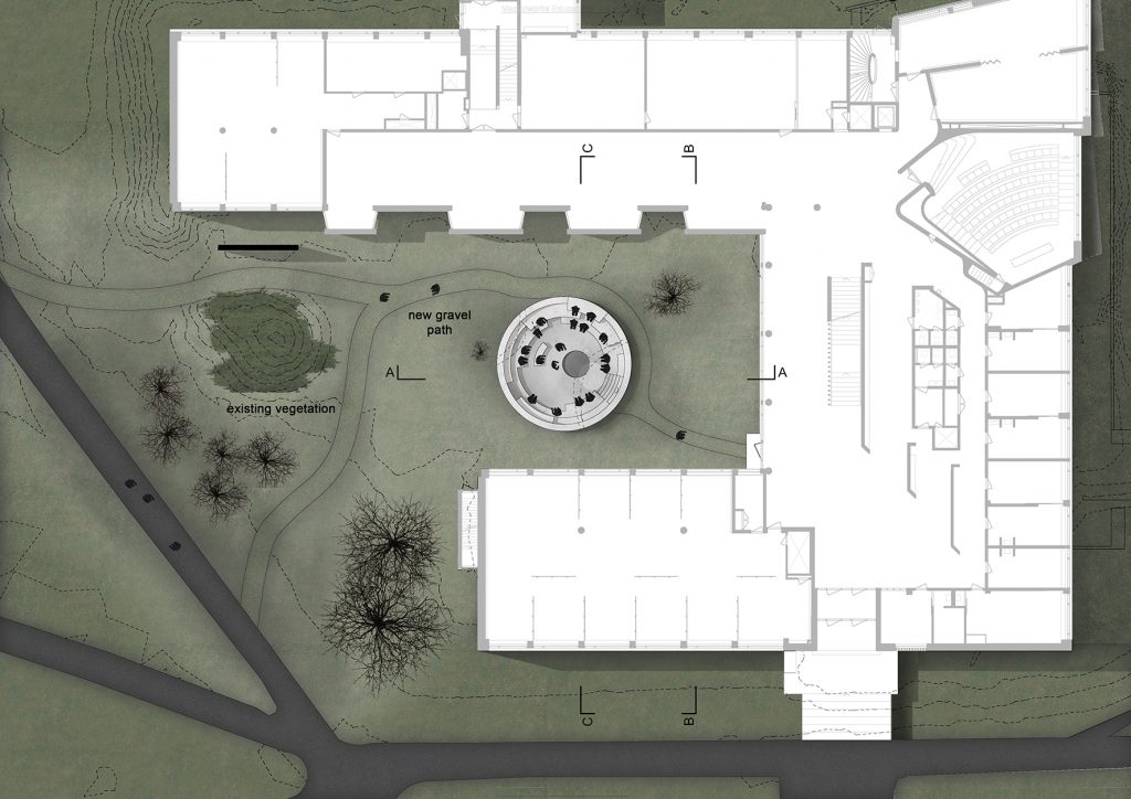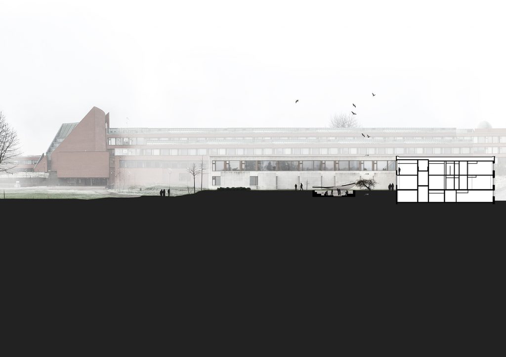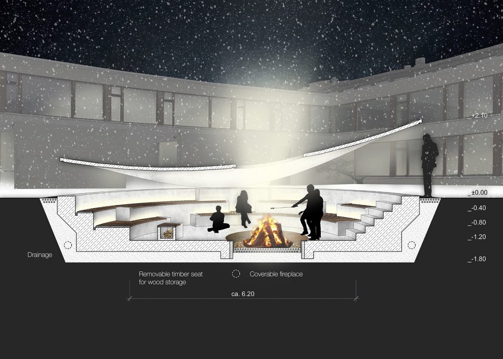 Jury’s statement The proposal is a microcosm, yet the primary element is a fireplace sunken into the courtyard, inviting social gatherings. The graphic presentation is convincing, especially the simple black-and-white diagram communicating the concept. Fire as an element and the sheltering form of the fireplace–auditorium propose a new social space, which is strategically sunken towards Alvarinaukio to decrease the instant visual effect in the landscape. However, since the fireplace-auditorium is such a strong element, the jury recommends that the proposal could be enhanced by giving up some of the secondary activities proposed and simplifying the design agenda to match the scale of the site. Despite the subtle visual connection to Alvarinaukio, the program and the design offer a bold project for the site that also reframes Alvar Aalto’s architecture. The proposal transforms the landscape of the building at the courtyard, today characterized by white marble and low grass. The effects of light from the fire and proposed projections are intriguing and suggestive.