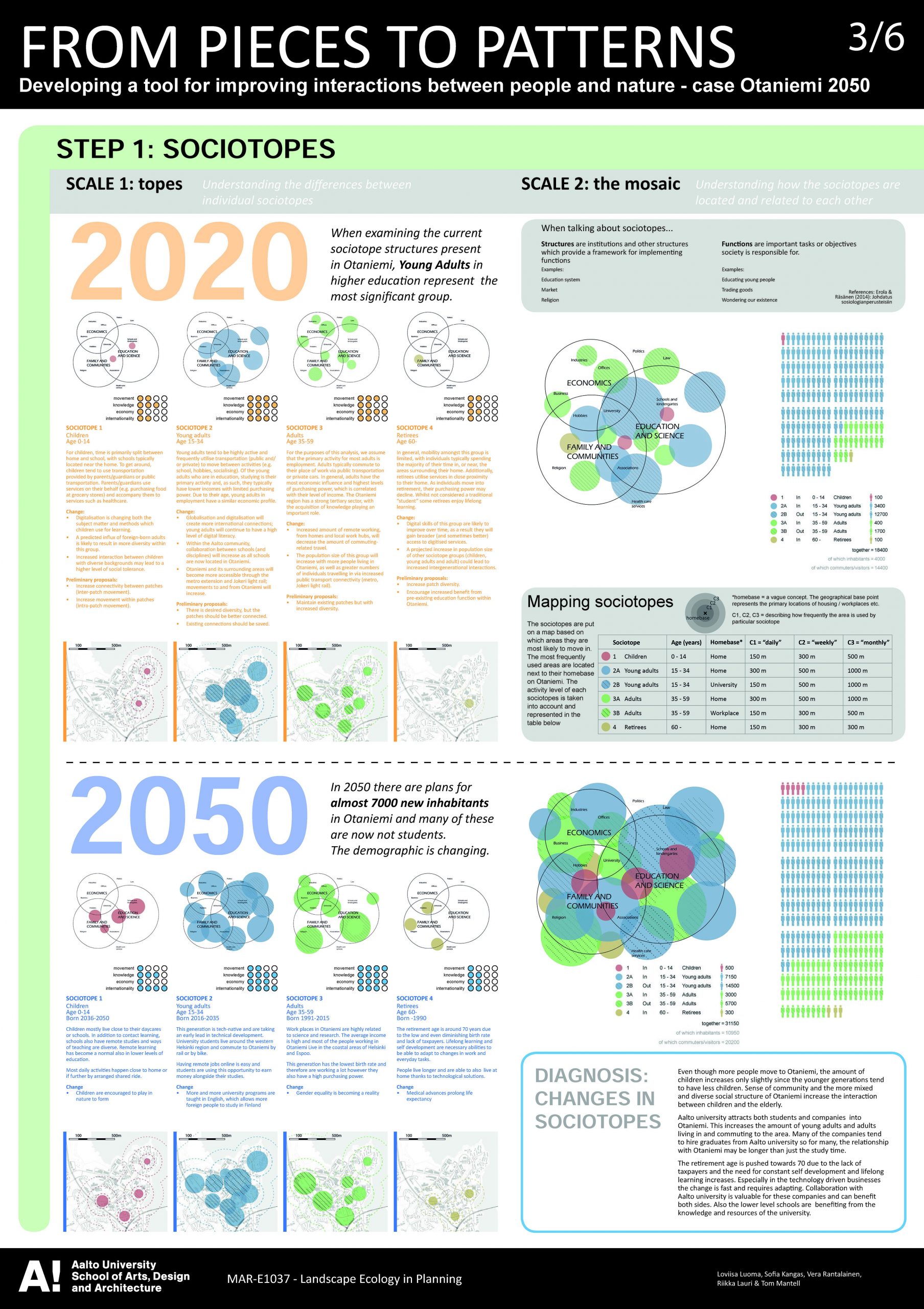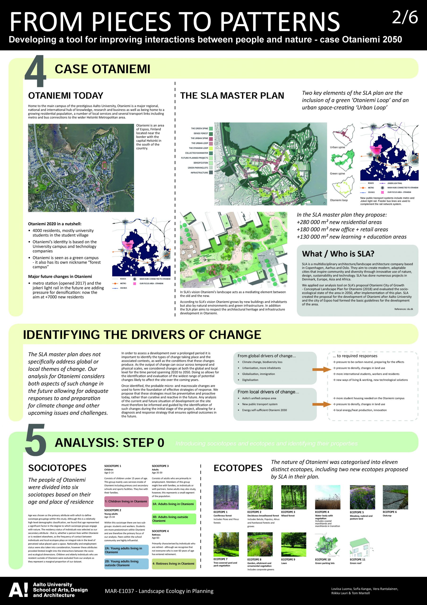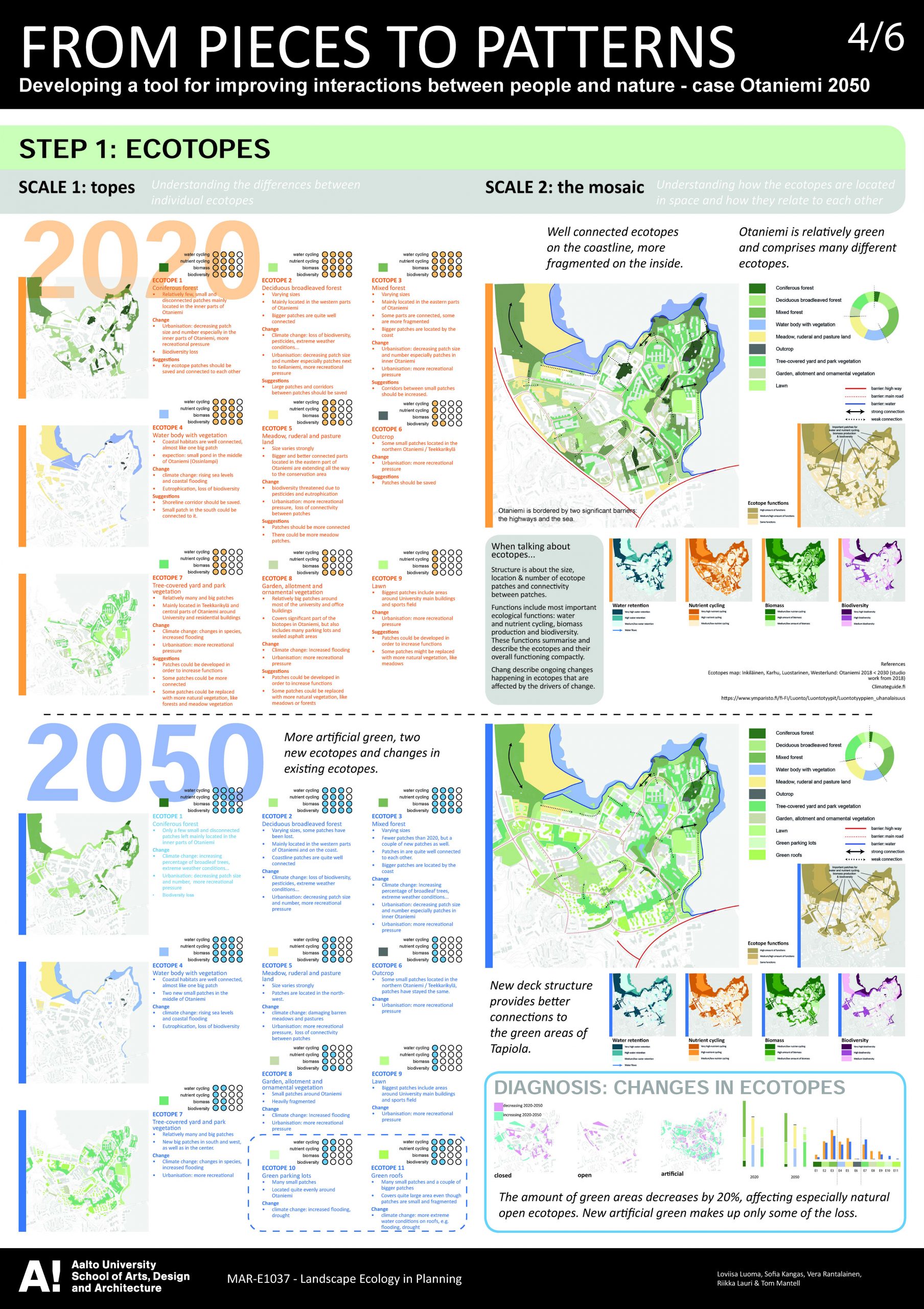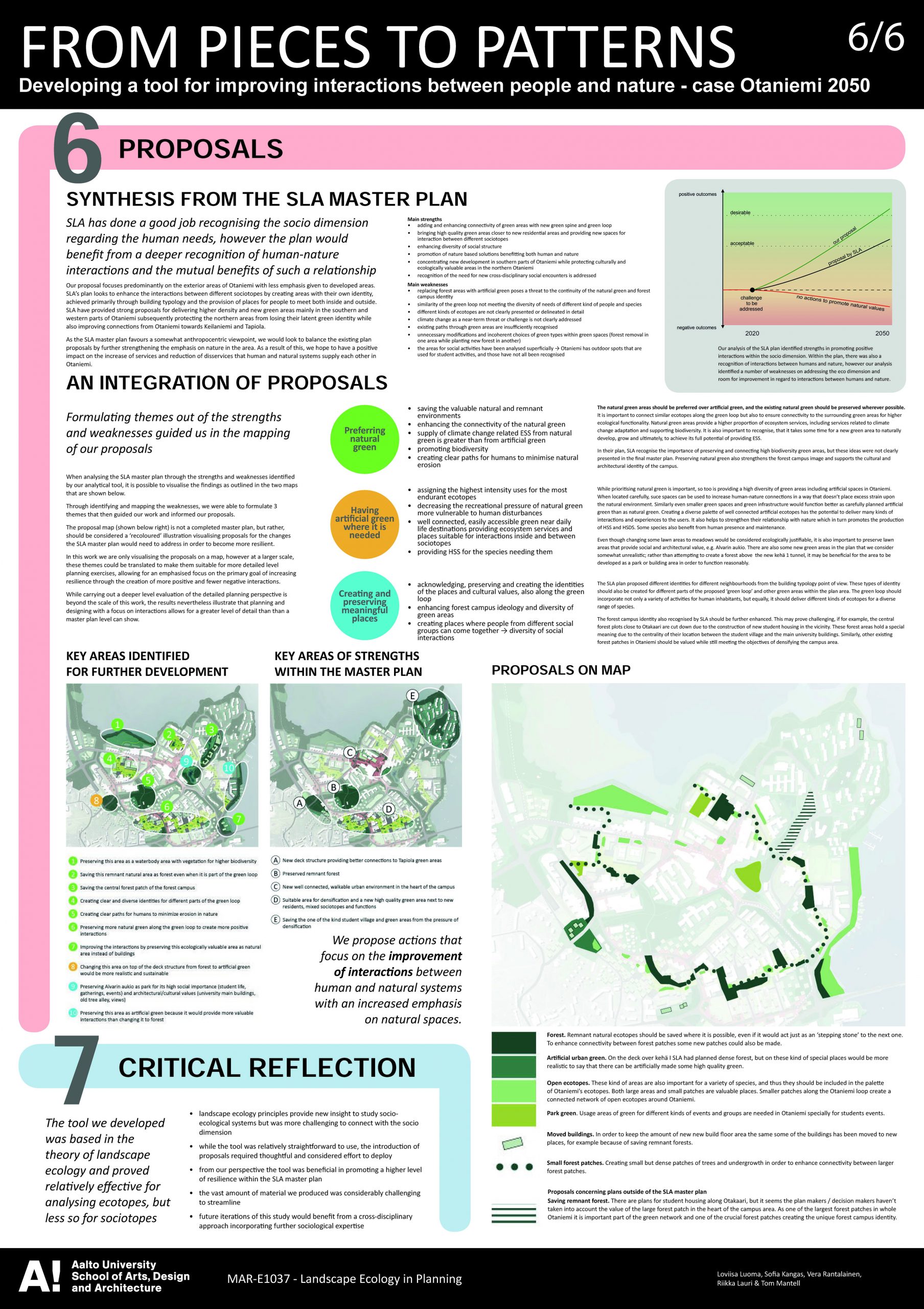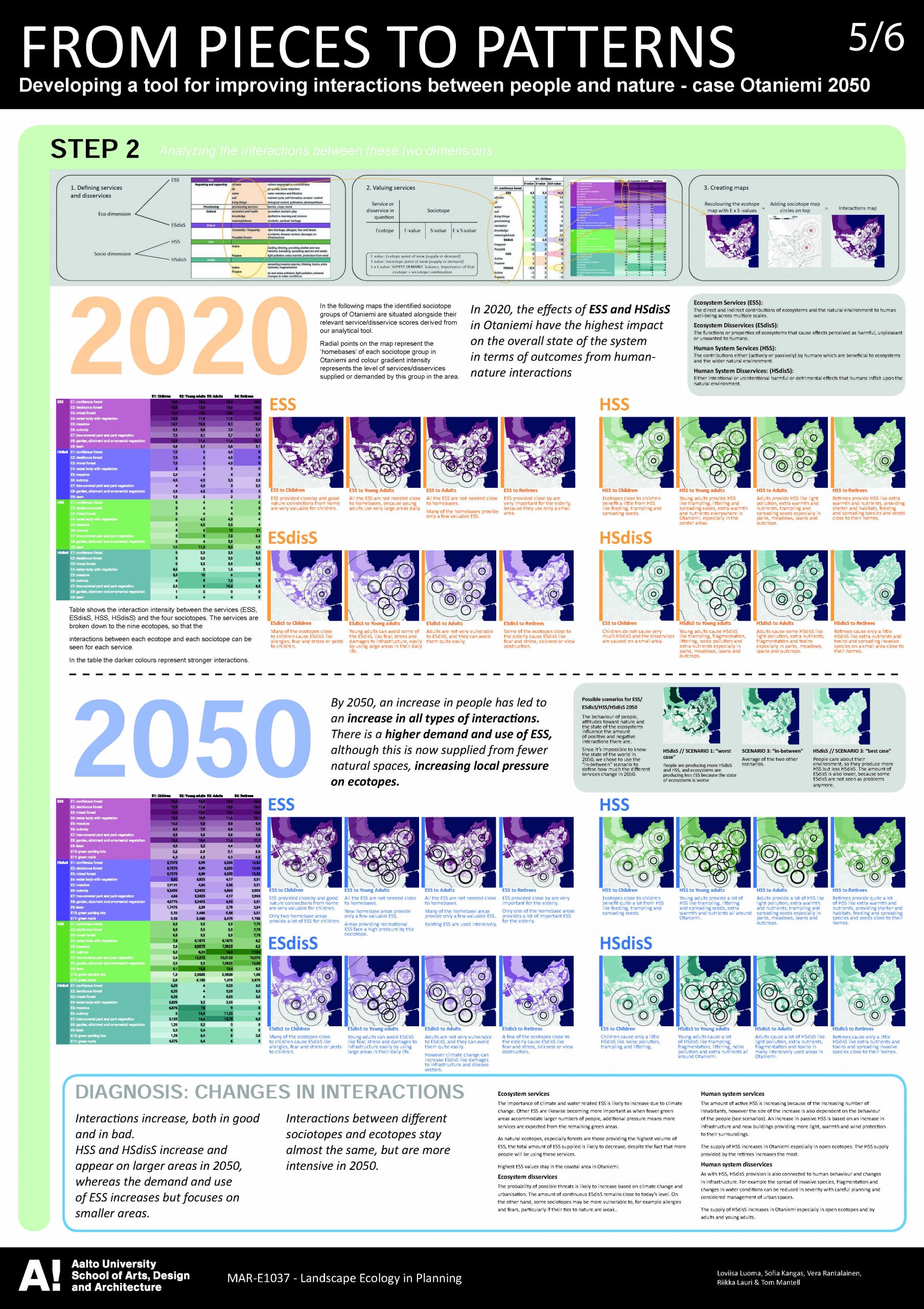 In order to cope with the potential magnitude of such changes, new master plans for Otaniemi have been defined. However, there is also a need for methods to analyze the potential resilience of these plans. The aim of this work was to attempt to create a new analysis tool that could be used to analyze a master plan proposal from the socio-ecological perspective and based upon the analysis, to improve the master plan in question. As a case study, we have applied this tool to analyze the master plan for Otaniemi in 2050 proposed by the landscape.