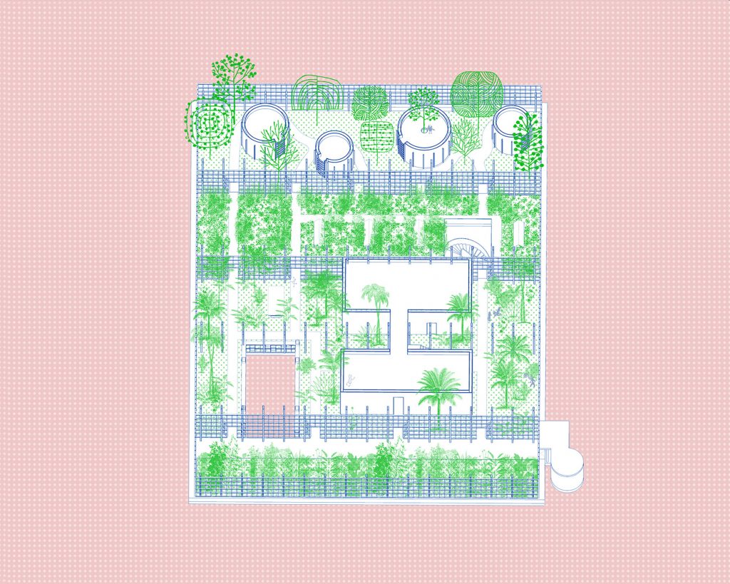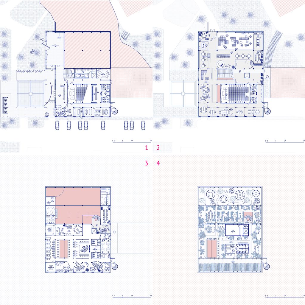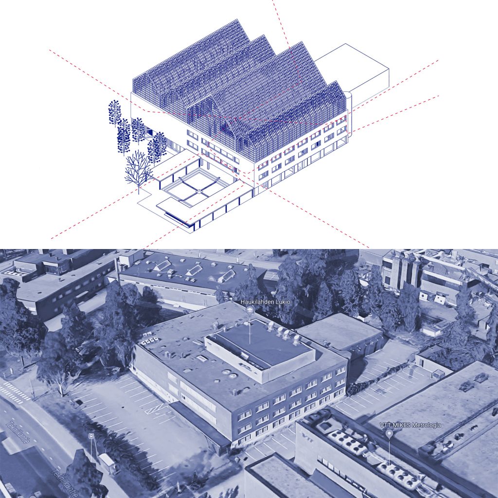 The task was to adapt an existing building from the Otaniemi campus for its new function as high-school. The challenge was to figure out what is the role of the building in a project-based, digitalised, dissipated learning process. Thus, the building, the “school” becomes the heart, the hub, the meeting place for students and teachers, a place sheltering a diversity of learning behaviors. A new type of school that focuses on the experience of the learner, a school which exploits all available resources as it expands across the limits of the building. The building transforms to become a hub, a social space where learning happens in interaction with others and with the environment. The variety of spaces emerges from the diverse manners in which learning happens. Each place has a strong identity, in contrast with the anonymity of the prototypical classroom. The project takes advantage of the existing configuration of the building to open it to the rest of the campus and connect it with the surrounding paths through several alternative entrances. The greenhouse on the roof works as a prolongation of the campus forest, a link with the natural context, identifier, lantern, and soft space for playful learning.