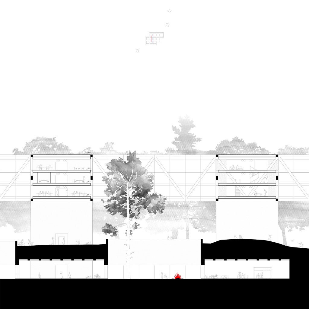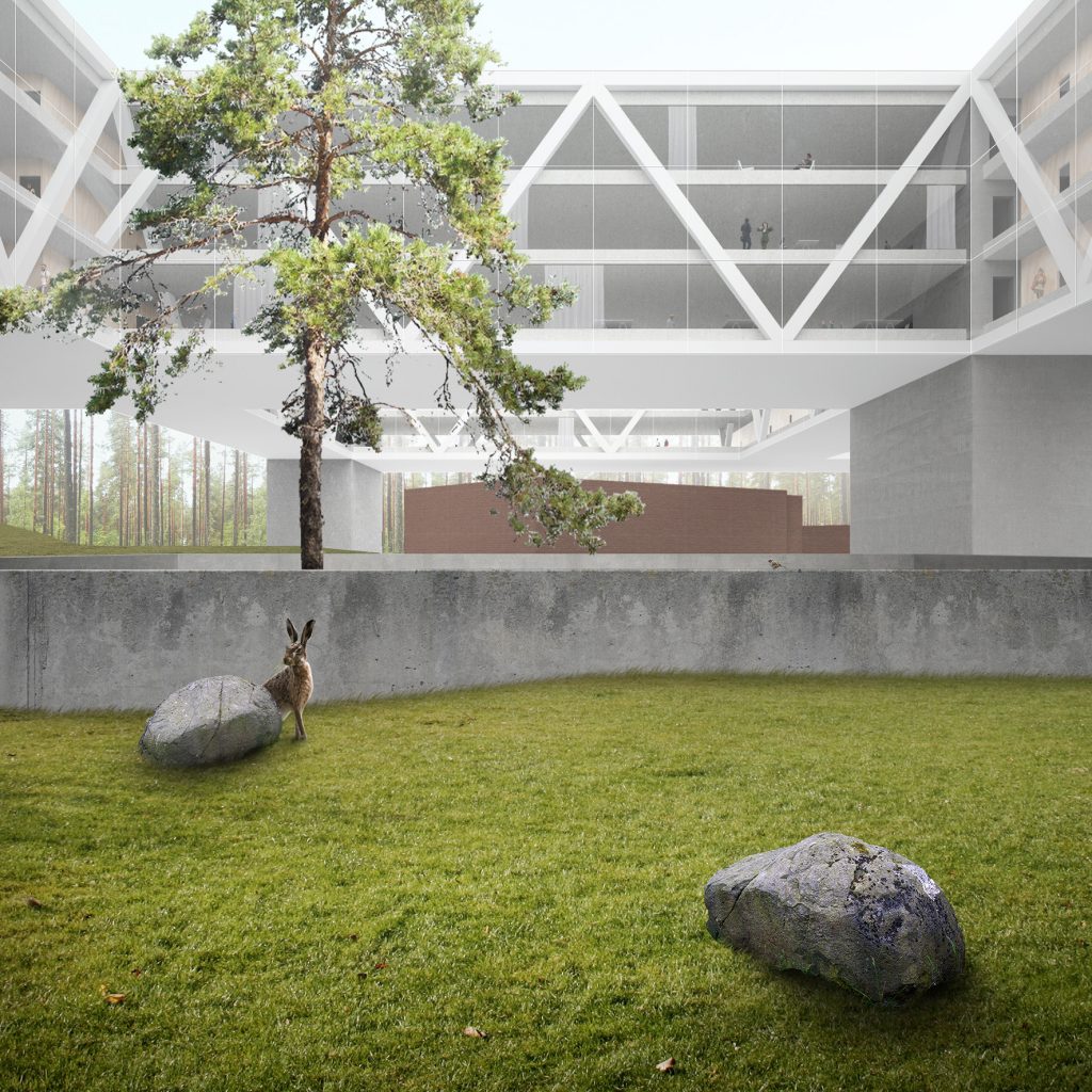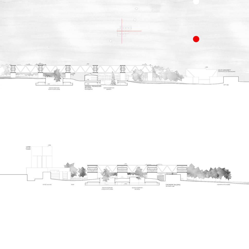 Skygrid is a uniform grid oriented by compass directions and lifted over ten meters above the ground. Free from all restraints, it contains a non-hierarchical system for working and living, for researching the big universe and experiencing it. On the ground, the only building masses are the vertical cores on top of which Skygrid rests. The trees, grass, and red brick buildings of Otaniemi can keep on living as before. Connection to home and history is preserved, but in a new dynamic situation. Sunken courtyards provide natural sunlight to an underground innovation area. Removed from all context, the underground presents an opportunity to concentrate and imagine with full freedom, unrestrained by prevalent thought patterns which manifest themselves in our present surroundings.