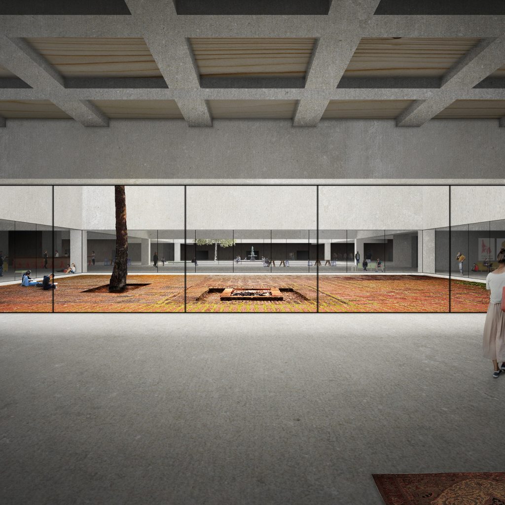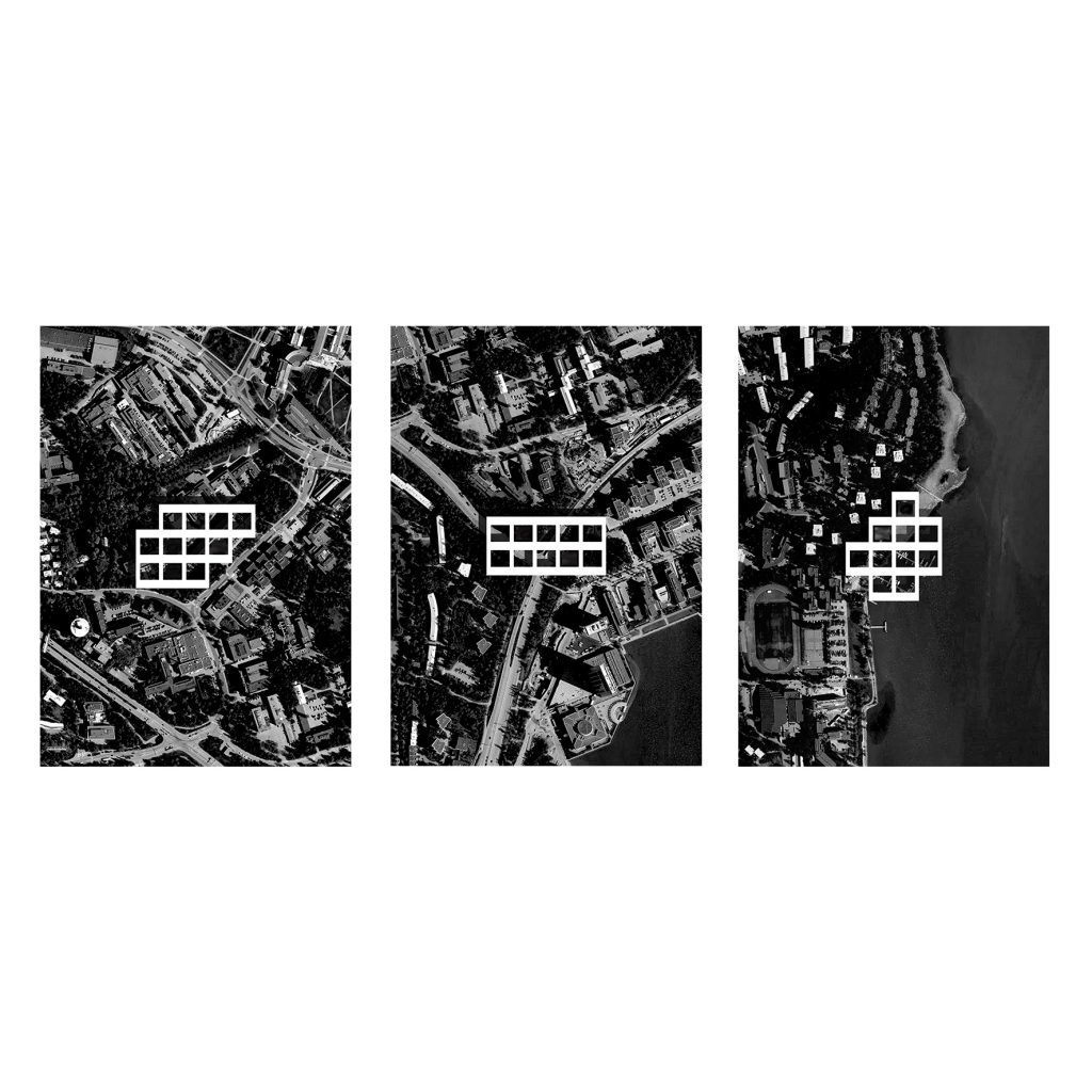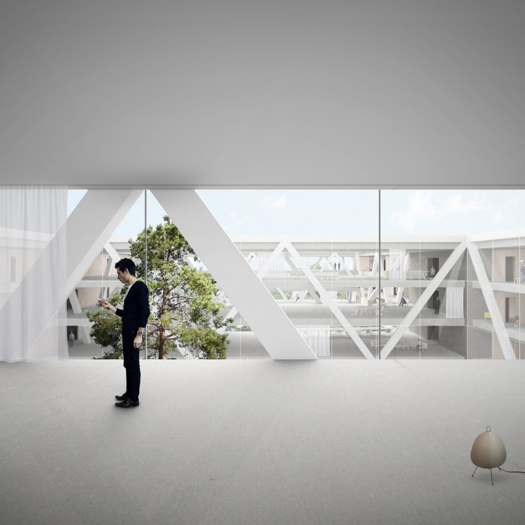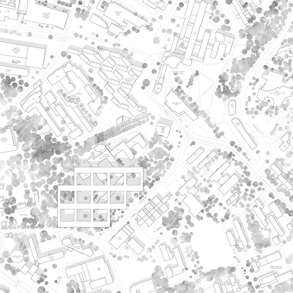 Skygrid is a uniform grid oriented by compass directions and lifted over ten meters above the ground. Free from all restraints, it contains a non-hierarchical system for working and living, for researching the big universe and experiencing it. On the ground, the only building masses are the vertical cores on top of which Skygrid rests. The trees, grass, and red brick buildings of Otaniemi can keep on living as before. Connection to home and history is preserved, but in a new dynamic situation. Sunken courtyards provide natural sunlight to an underground innovation area. Removed from all context, the underground presents an opportunity to concentrate and imagine with full freedom, unrestrained by prevalent thought patterns which manifest themselves in our present surroundings.